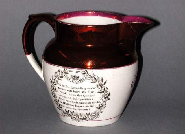 Two views of a ‘Caroline’ jug, inscribed with the names of her supporters (Brougham, Wood, Lushington, Williams, Waithman and Denman) in a garland round a rhyme which somewhat distorts a verse of the National Anthem: ‘As for the Green-Bag crew,/ Justice will have its due,/God save the Queen!/Confound their politicks,/Frustrate their knavish tricks,/On HER our hopes we fix,/ God save the Queen!’ On the reverse is an image of the queen. As with the jug above, the factory is unidentified. (Credit: the Fitzwilliam Museum: C.1162-1928)