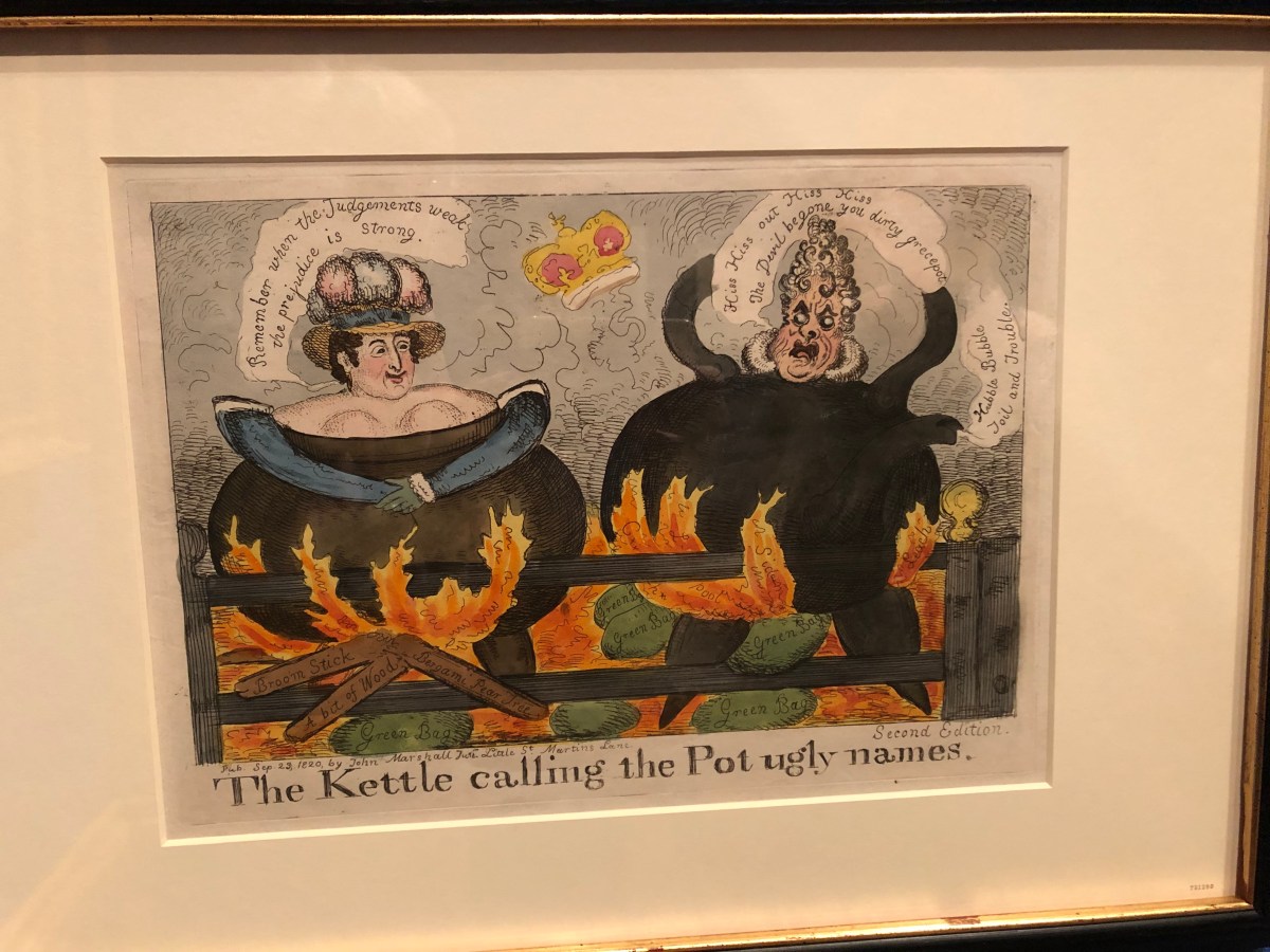 This cartoon by John Marshall, published in September 1820, shows the queen and king enacting the old proverb of the pot calling the kettle, in reverse. The ‘green bags’ stoking the flames are the green baize bags of evidence carried into court. Of the sticks of wood fuelling the queen, ‘Broom Stick’ is Henry Brougham, ‘A Bit of Wood’ is Sir Matthew Wood, Lord Mayor of London and radical politician, and ‘Bergami Pear Tree’ (cf. the Italian Bergamo pear) is Bartolomeo Pergami, Caroline’s Italian factotum (and alleged lover). George’s supporters are written in his flames. (At the exhibition George IV: Art and Spectacle at the Queen’s Gallery (reopening today, apparently!), this was almost the only image of his wife.)