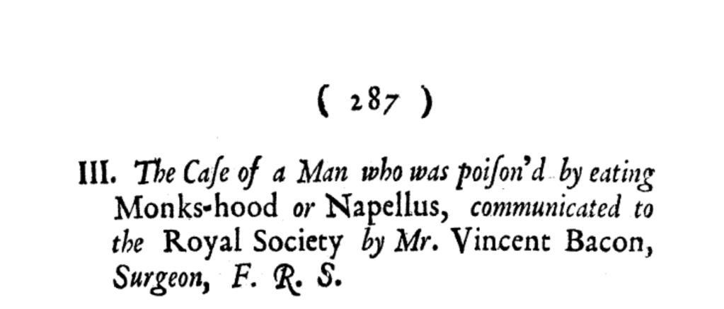That Garthwaite and Bacon were close is indicated by the fact that he nominated the sisters as guardians of his daughter Mary in the event of his death. Vincent was, unusually, a member of the Barber-Surgeon’s Company as well as the Society of the Apothecaries, and was also elected a Fellow of the Royal Society in 1732 (one of his sponsors being the astronomer Edmond Halley), publishing in the Transactions of 1733–4 an account of a man almost poisoned by a salad containing monkshood, which his kitchen boy had picked in the garden, believing it to be celery.