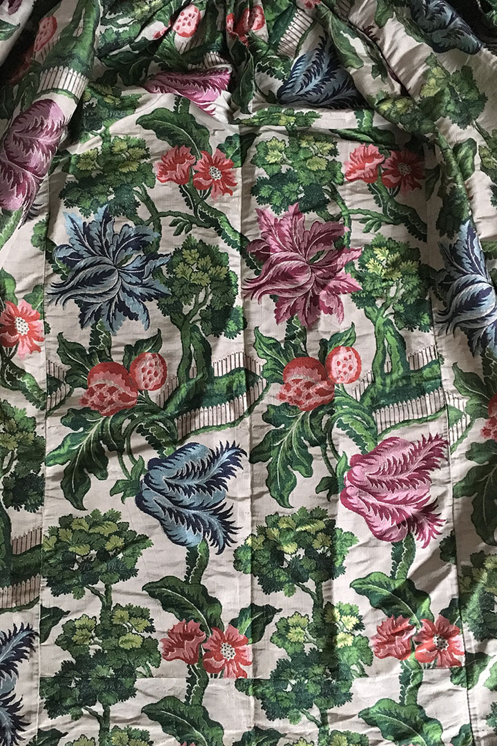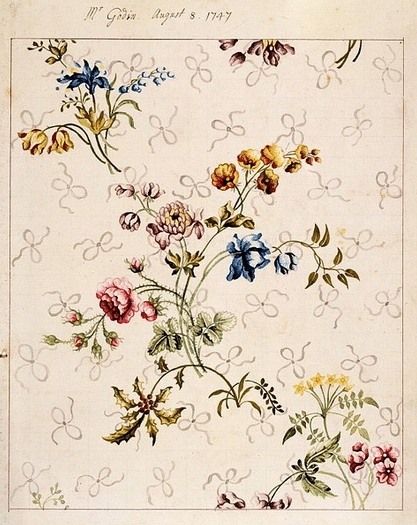 Garthwaite’s father died in 1719, and she moved to live with her elder sister Mary, who had married as her second husband Robert Dannye, the rector of Spofforth, near York (her first husband had held the same benefice). It is conjectured that visits to York increased her knowledge of textiles and fashion. However, Dannye died about 1729, and it was at this point that she and her sister moved south, finally settling in a house in Princes Street (now Princelet Street) in Spitalfields, then just outside London. Sadly, we have no idea what influenced her decision to make her living as a professional designer; however, her younger sister Dorothy had married another Grantham clergyman, Edward Bacon, in 1724, and his brother, Vincent, who was an apothecary and botanist, lived nearby (though he himself later moved up to Grantham). (Thomas Martyn, in his Plantae Cantabrigienses, or, A catalogue of the plants which grow wild in the County of Cambridge … (1763) names him as one of ‘those Men, who, though they never published any Thing, upon the Subjects, have nevertheless contributed in some degree to improve this part of the Natural History of their Country’.)