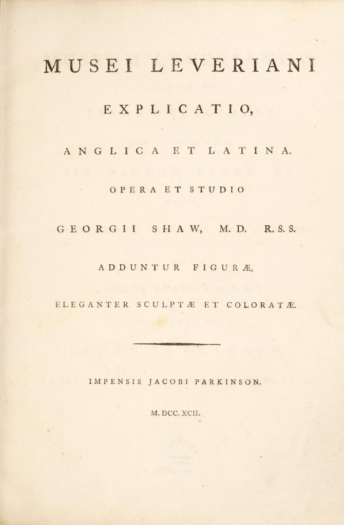 The sale catalogue listed 8,000 lots, but the total amount raised was only £6,600. Many European buyers came over, either private collectors or the representatives of national museums, so that the collection was very widely dispersed. In addition to the sale catalogue and the guide, a more extensive record of it survives in the Musei Leveriani explicatio, written by Parkinson’s friend George Shaw and published at Parkinson’s expense, of which Volume 1 came out in 1792; Volume 2, of 1796, was left unfinished.