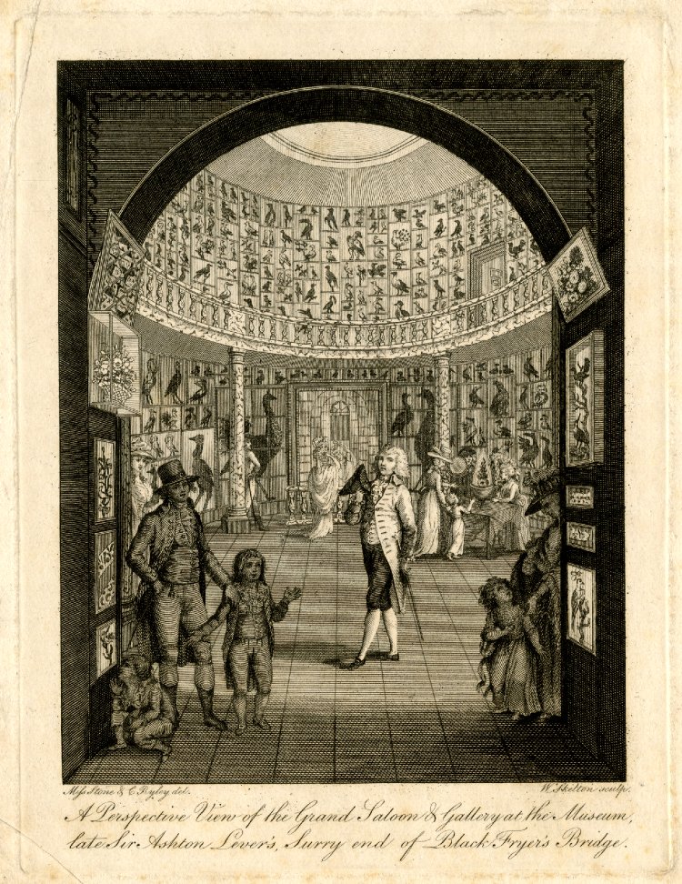 The Leicester House Holophusikon, which consisted of about 25,000 items (a small fraction of Lever’s total collection) opened in February 1775 as a commercial enterprise: entry cost between 2s.6d. and 5s.3d, while a season ticket was available for two guineas. It became well known (and Lever was knighted in 1778 for his contribution to natural history), but it did not make money, and by 1783 Lever was deeply in debt and trying to sell the collection. Sadly, though he wanted it to go to the nation, the British Museum refused to buy it (in spite of Parliamentary support from the likes of Sir William Hamilton, and testimony to its value by Thomas Pennant).