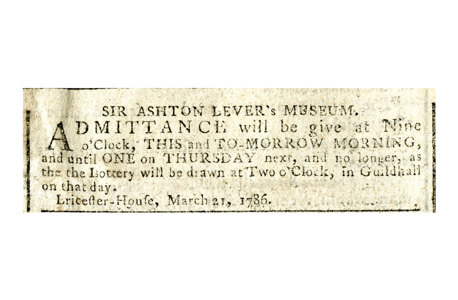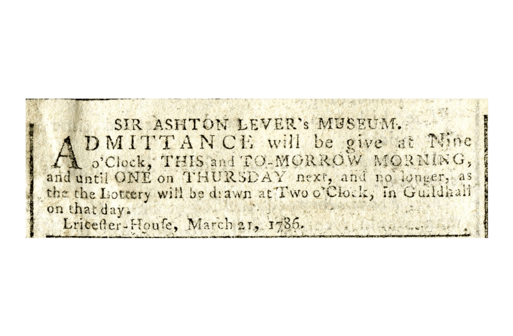 Lever therefore obtained permission from the government to offer it as a first prize in a lottery, drawn in March 1786. Only 8,000 one-guinea tickets of the 36,000 printed were actually sold, and it is therefore very unlikely that Lever raised anything like the true value of the collection, estimated at the time as about £53,000. After its disposal, he returned to Alkrington, dying two years later of an apoplectic fit.