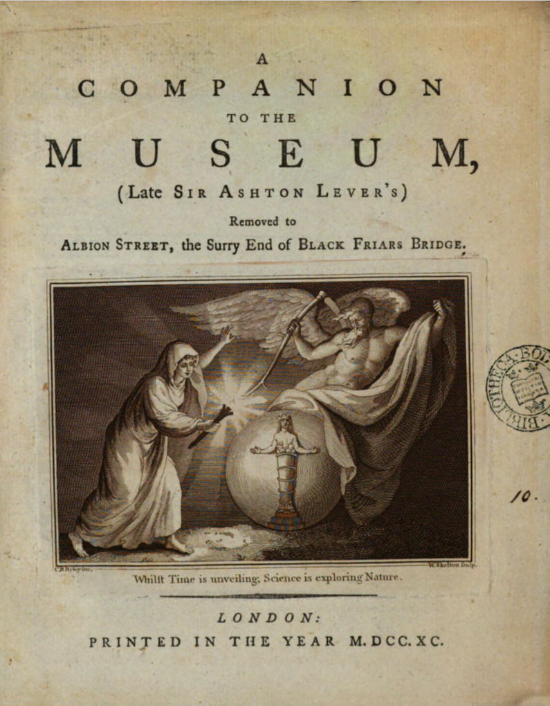 By now, the collection consisted not merely of stuffed birds and animals, shells and fossils, but also of artefacts and what today would be called ethnographic material from around the world. (Lever displayed some antiquities, but these were mostly medals and casts.) One is reminded of the cabinets of curiosities, such as that of Ole Worm, from the previous century. Some of the material was very recently acquired from the voyages of James Cook.