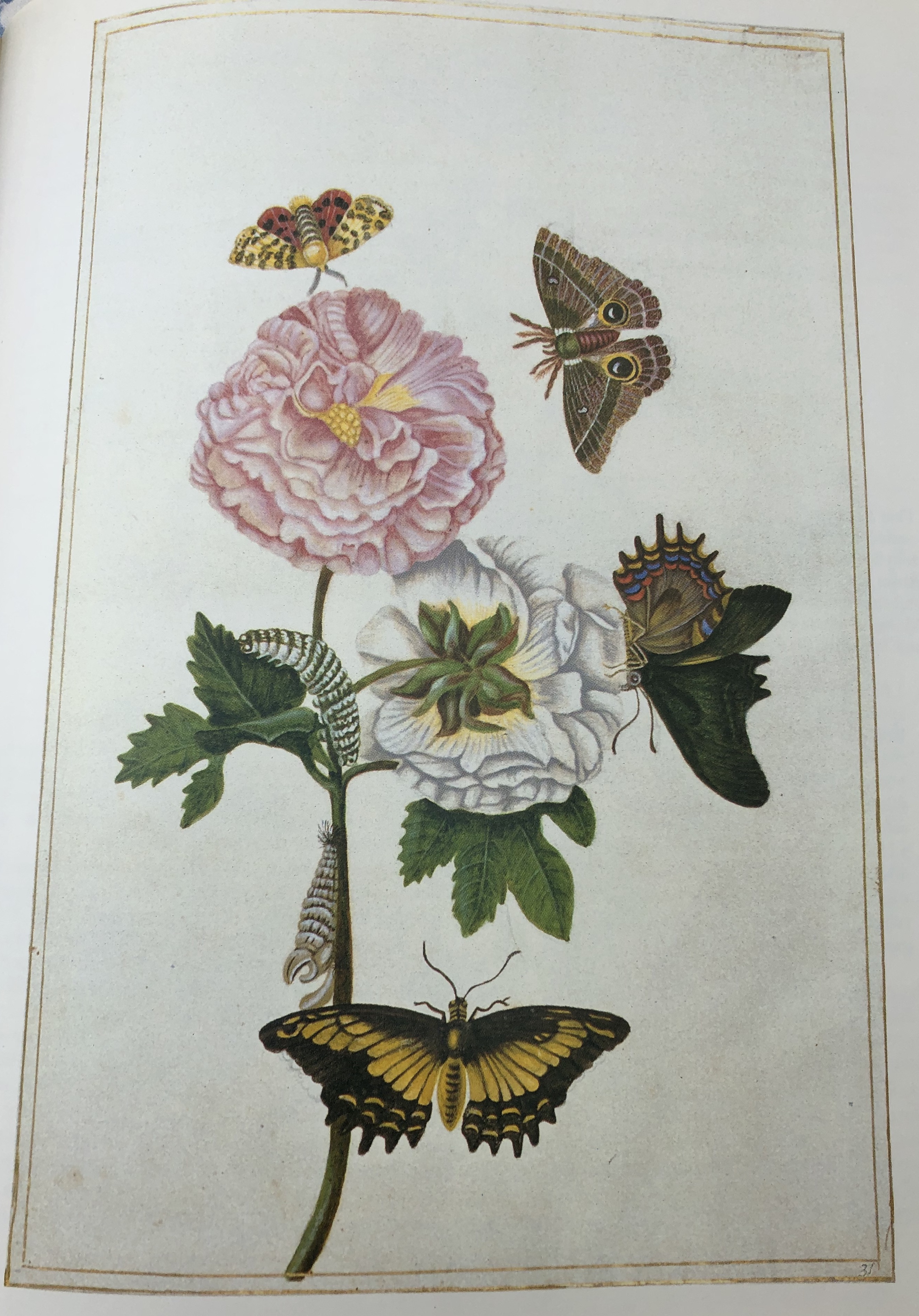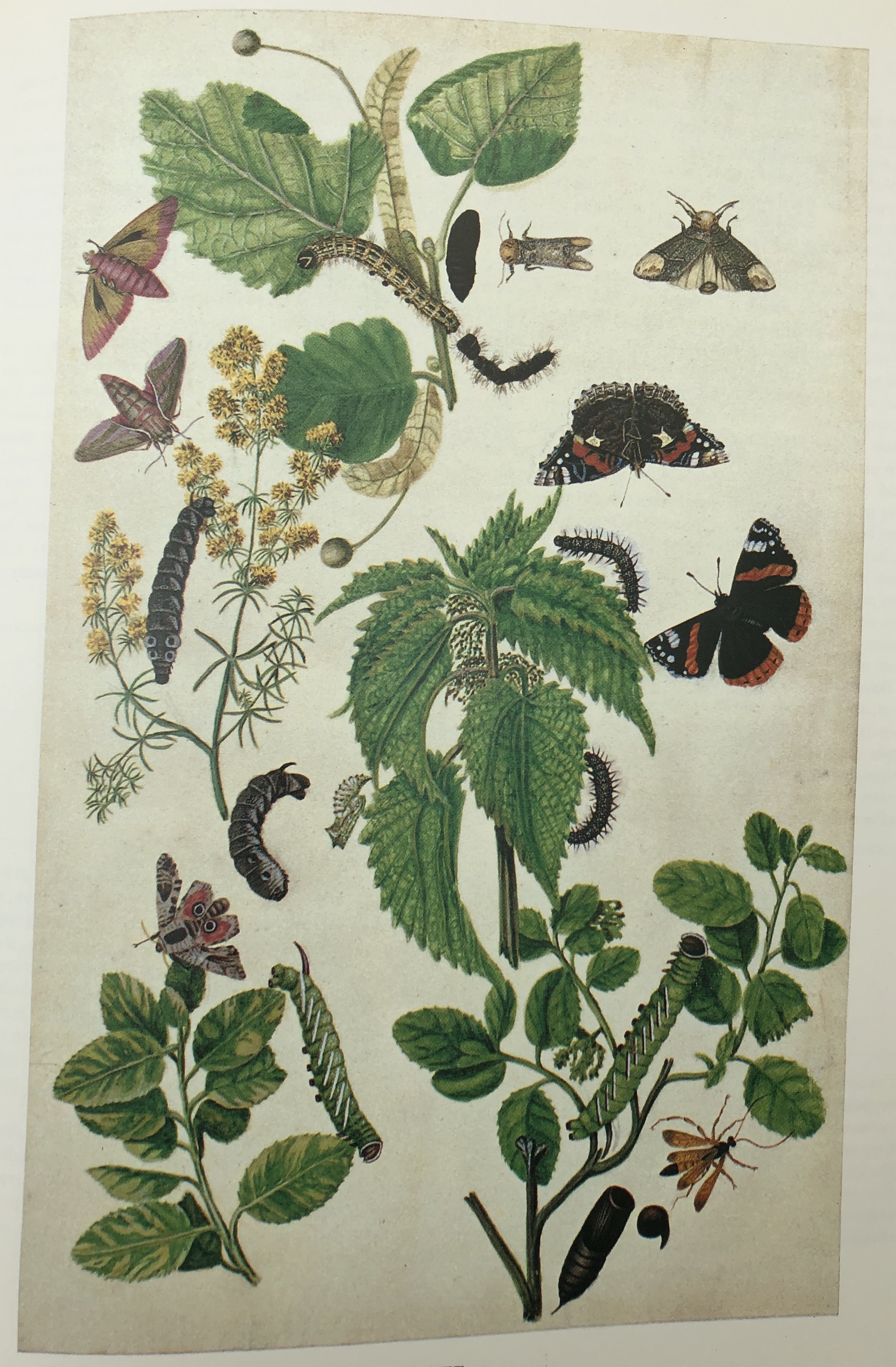 Interestingly, Frankcom was not confined to living plants – he copied several plates from Maria Sibylla Merian’s Metamorphosis Insectorum Surinamensium (first published in 1705), and also painted a composite plate showing British butterflies and moths, their caterpillars, food plants and chrysalids. The duchess had a collection of insects, and I assume that she asked for this painting and the Merian copies to be made?
