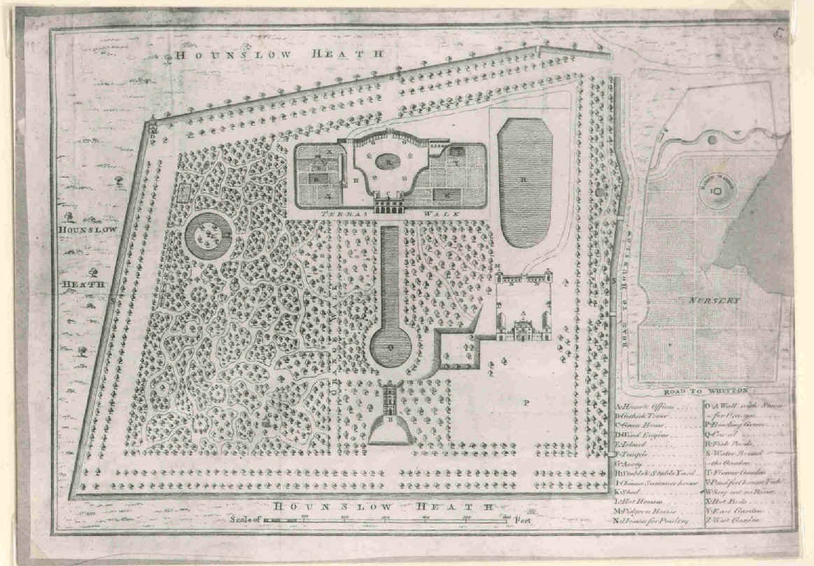 But in spite of relentless and tortuous political activity, the third duke found time for scholarship (he had one of the largest libraries in western Europe), and particularly for botany. Early in his career, he acquired an estate near Richmond, added to it forty acres of Crown land on Hounslow Heath, and turned it into a garden. He was never concerned to build a large house, but until his villa, Whitton Place, was completed on the site in the 1730s, he lived in the gardener’s cottage. The first thing he built was a greenhouse (not a glasshouse), ‘80 feet in length with a hipped roof and an open rusticated loggia of five 10-foot bays’ according to this interesting site.