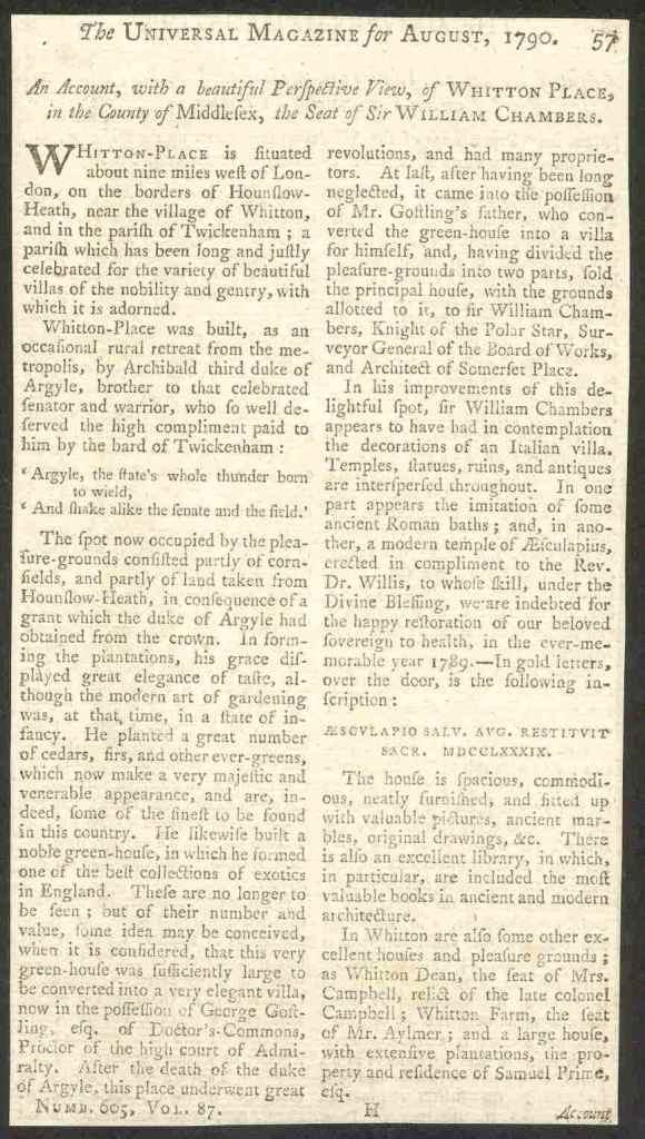 But the duke did build a ‘Chinese’ pagoda, lots of waterways, a tower, a moat and large bridge, and he imported exotic plants to fill the greenhouse, including the famous ‘tea tree’. Elizabeth Williams lived at Whitton Place until her death a year after the duke, in 1762, at which point the earl of Bute (who had become George III’s prime minister in the same year) seems to have swept in and carried off the choicest and rarest plants to the emerging royal botanic garden at Kew. The estate was put up for sale in 1765, and was lived in by the Gostling family until 1894. They converted the greenhouse to a house, and sold part of the land and the duke’s villa to Sir William Chambers; it was later owned by Benjamin Hobhouse, father of the more famous John Cam Hobhouse, friend of the even more famous Lord Byron.