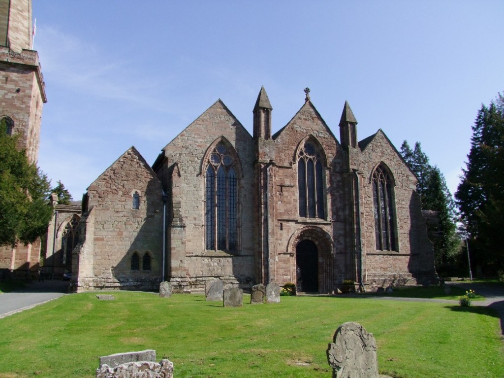 The church itself is unusual, in that it has a separate bell tower, the ground floor of which now houses a small exhibition about its history. The church, of red sandstone, was originally built in the eleventh century (probably on the foundations of a Saxon minster), and there are remaining traces from this early Norman period, but its current form dates from the thirteen and fourteenth centuries, while the tower (with eight bells) dates from c. 1230 (though its spire was added in 1733). Spacious and full of light, it is also full of monuments, from medieval effigies to Tudor brasses to carvings by Westmacott and Flaxman, to the memorial to Mr and Mrs Moulton Barrett, parents of the more famous Elizabeth Barrett Browning. (The family lived in Ledbury as well as in Wimpole Street.)