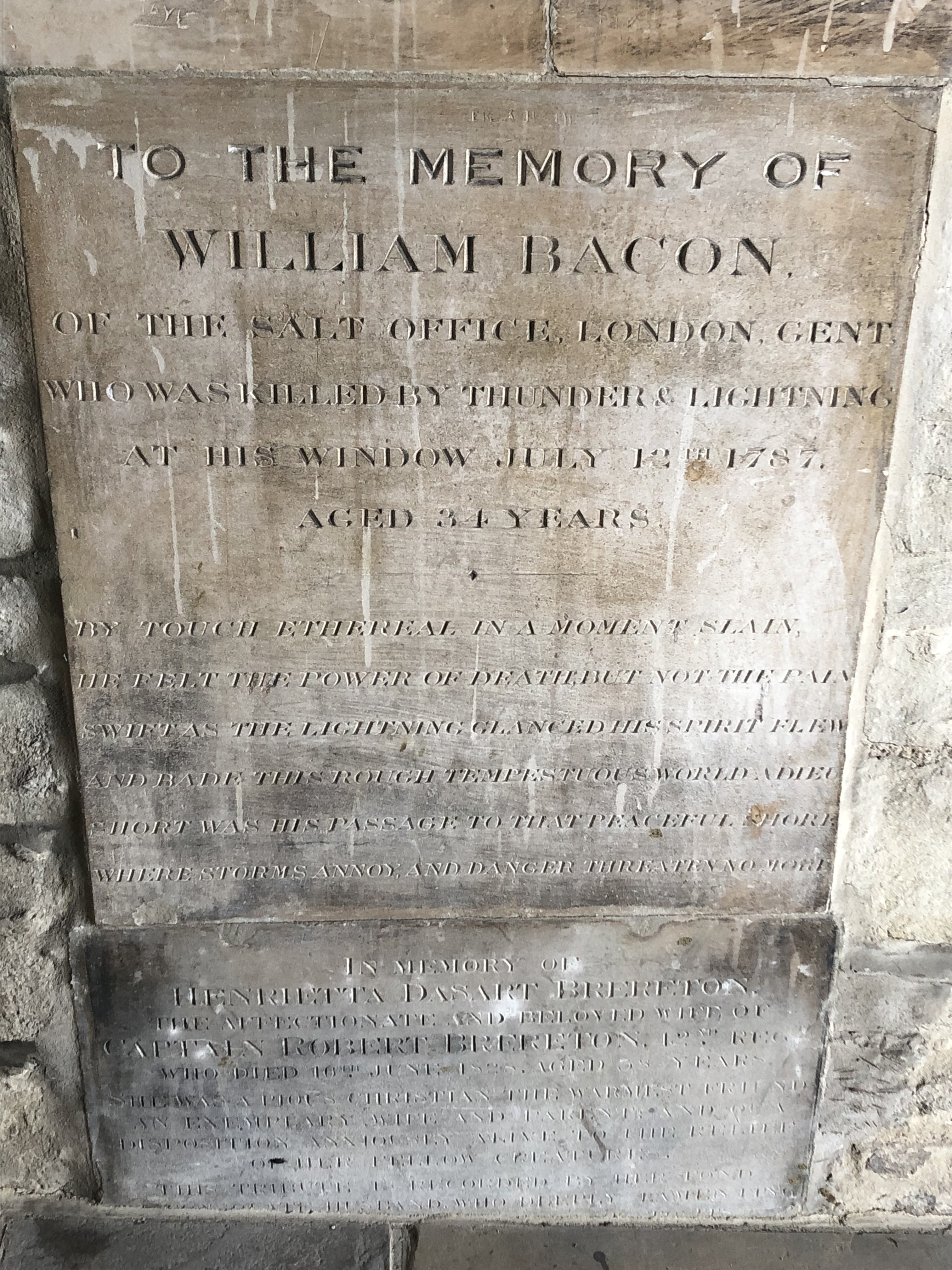 Poor William Bacon, formerly of the Salt Office, was tragically killed ‘by touch ethereal’ on 12 July 1787. Luckily for me, David Bingham has written already in gruesome detail about this sad incident in his terrific blog, ‘The London Dead‘ – the only thing I haven’t been able to find out is what and where the Salt Office was. I assumed at first that it was the office which controlled the quality of imports and exports of salt, and so was likely to have been on the riverbank nearby? Or did it in fact administer the salt tax? This was an on–off tax, reimposed after an abeyance just before the start of the Civil War, revoked in 1660 at the Restoration, re-imposed by William and Mary in 1693, doubled in 1696, and eventually abolished in 1825 (though not after a revolution, like the French gabelle). Any information gratefully received!