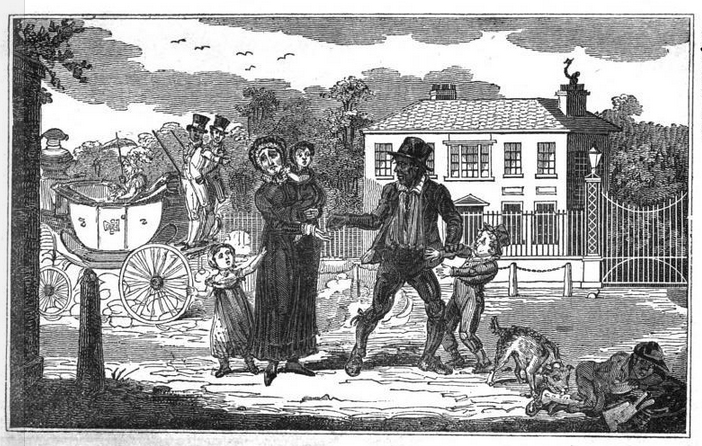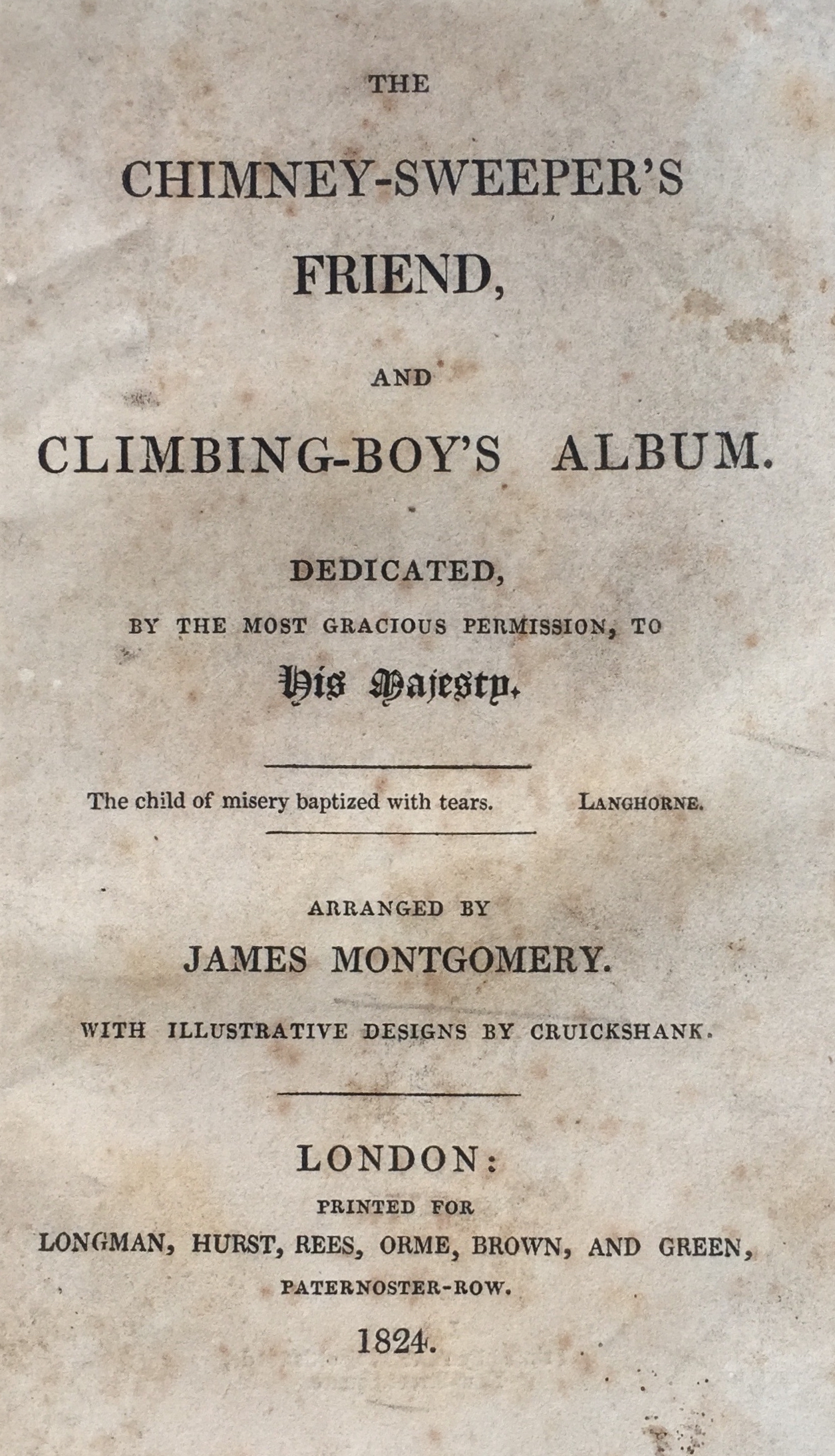 The sufferings of young chimney-sweeps were well known before Jonas Hanway and others began to campaign for them in the 1760s: boys as young as four years old were ‘apprenticed’ to sweeps as they were small enough to climb from the hearth to the top of the chimney, clearing soot as they went. Sometimes they were incentivised by having pins stuck into the soles of their naked feet, or by having a fire lit in the hearth; and some were the victims on one of the earliest industrial diseases, the so-called ‘chimney sweep’s cancer’ caused by the constant irritation of coal tar soot on the naked skin. The Chimney-Sweeper’s Friend, and Climbing-Boy’s Album, compiled by James Montgomery (1771–1854), poet and philanthropist, with illustrations by George Cruikshank, was not of course a book for the boys themselves but an effort to force upon the attention of the people whose chimneys were being cleaned the cruelty of the process.