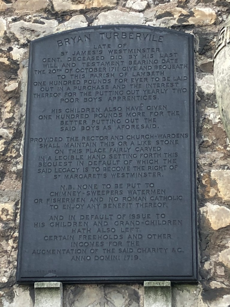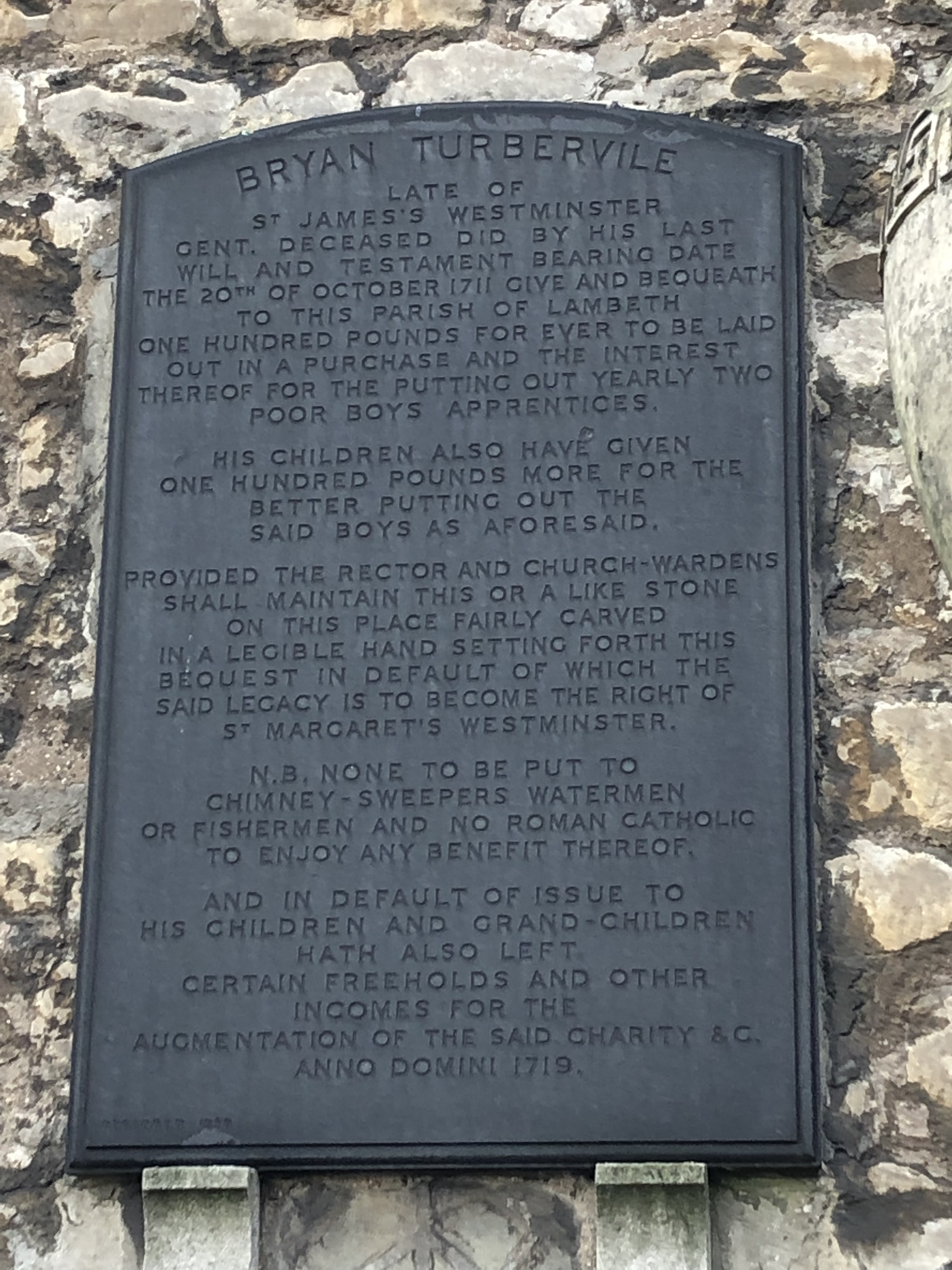I have not so far found out much about Bryan Turberville, except that he was obviously a wealthy man. Why he favoured the parish of St Mary, on the other side of the river if he lived in St James’s, is not clear, but his bequest survives, though it and several others from the seventeenth to the twentieth century have been subsumed into the local charity in Lambeth, the Walcot Foundation. A block of flats nearby is called Turberville House, but beyond that, not much … the Turberville name had appeared in Glamorgan and the West Country for many centuries previously (and judging from the name, they may have come over with William the Conqueror); but in the sixteenth century Turbervilles were notable recusants, so that the specific clause, ‘no Roman Catholic to enjoy any benefit thereof’, does not quite fit. It is nice to think, however, that Bryan Turberville, Gent., was concerned that the children who were to benefit from his bequest should not be apprenticed into the dangerous trades of chimney-sweep, waterman or fisherman.