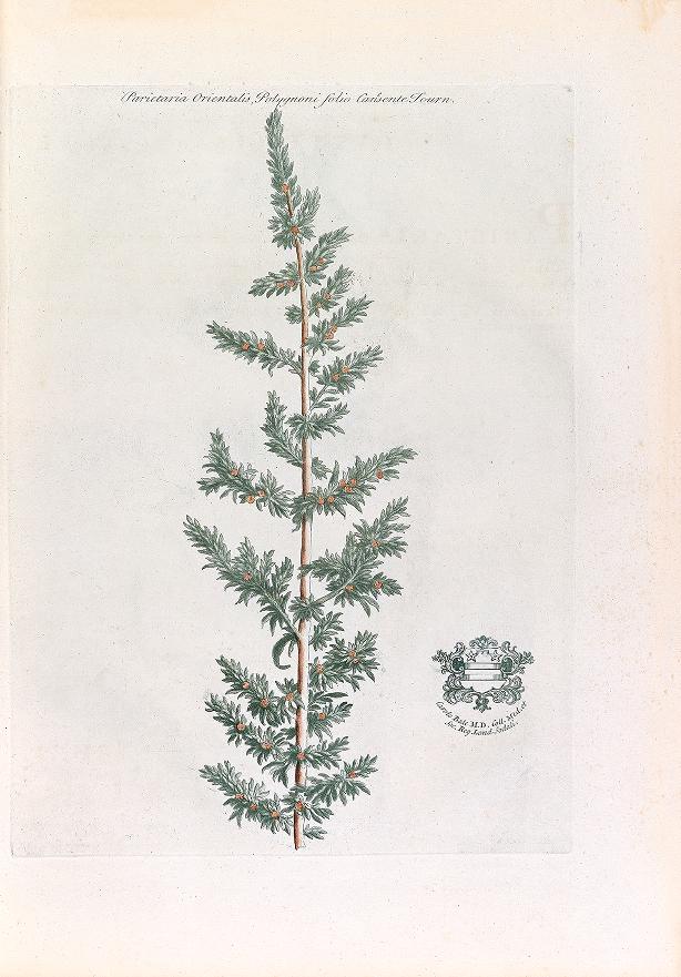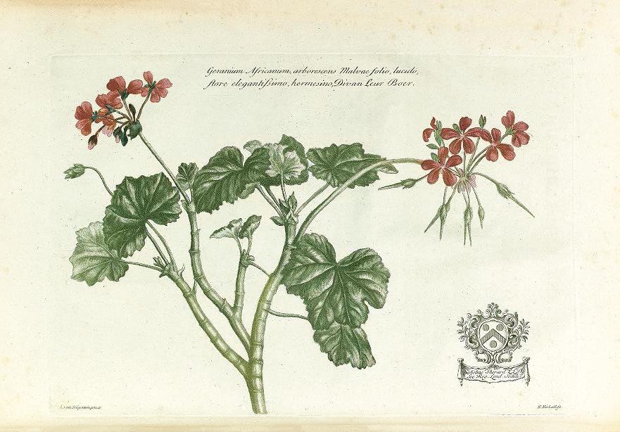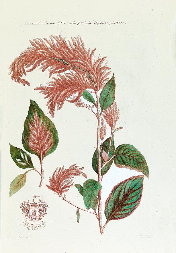 Jacob had also made the acquaintance of John Martyn, physician and later Professor of Botany at Cambridge University, for whom he drew many plates for his Historia plantarum rariorum (five ‘decades’, of ten plates each, between 1728 and 1737), also engraved by Kirkall. These books contain some of the earliest attempts at printing copper plates in colour, though Wilfred Blunt, in The Art of Botanical Illustration (1950), p. 133, is rather dismissive of them: ‘[The plates were] engraved by Kirkall in what is generally called “mezzotint printed in colour”. The phrase is misleading … Kirkall achieved a half-hearted imitation of true mezzotint by rather clumsily roughening the toned parts of the plate with a roulette and leaving the rest of it untouched. The so-called “colour-printing” was equally elementary: many of the figures are merely printed in a mossy green and touched with water-colour; in a few of the others, two or three different coloured inks have been used in a single printing.’