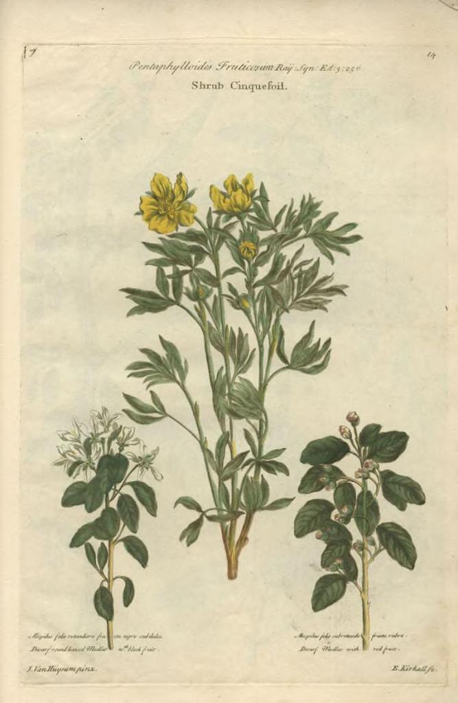 and this cinquefoil, where the names of the artist and the engraver (Elisha Kirkall, (1681/2–1742, himself an artist and innovative engraver) are more legible on the BHL scan of the copy of the book in the Natural History Museum, London, than on some other pages.