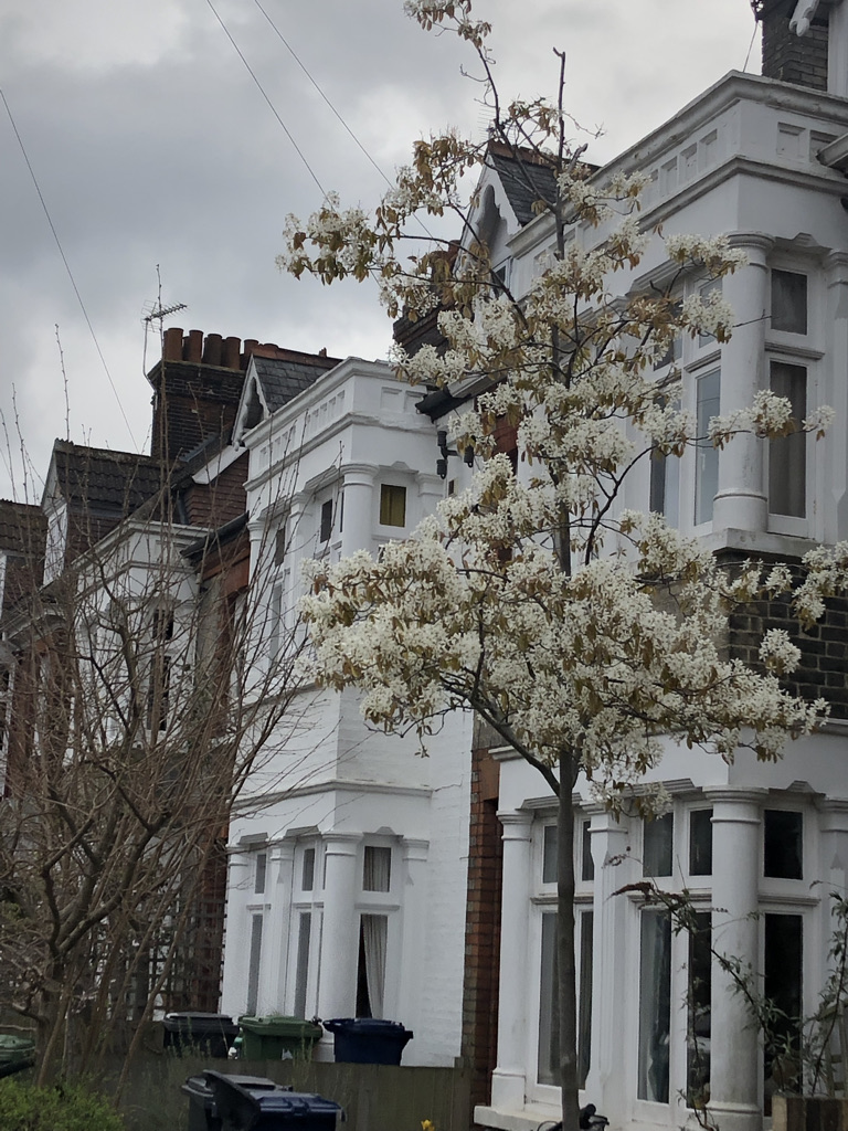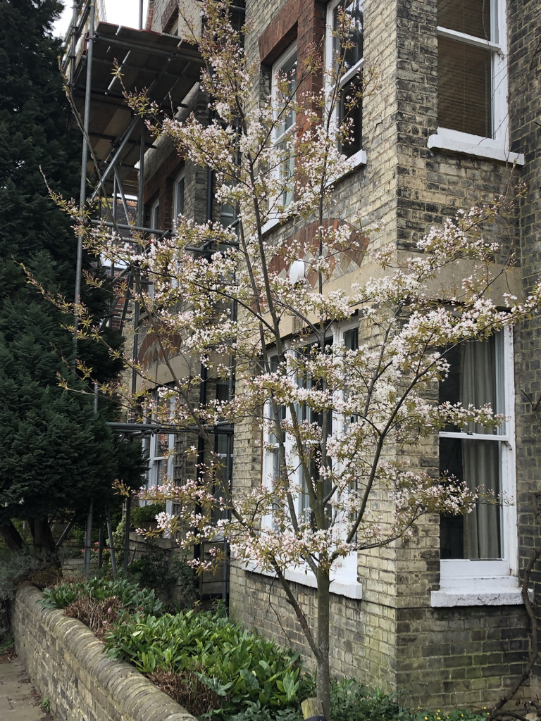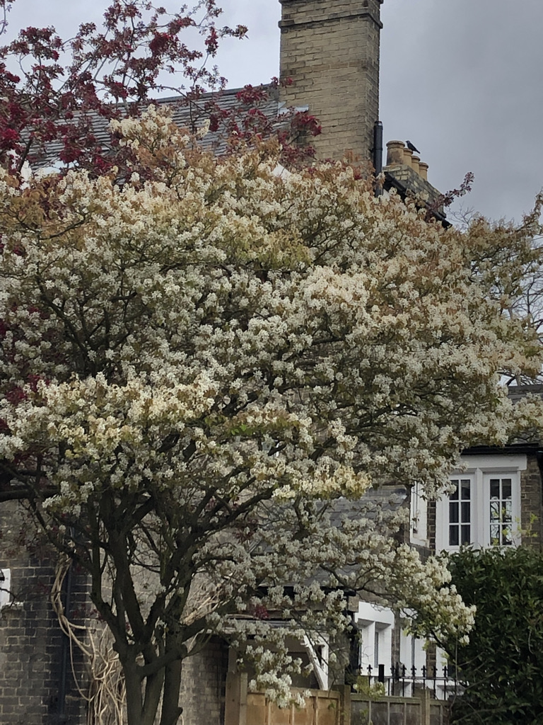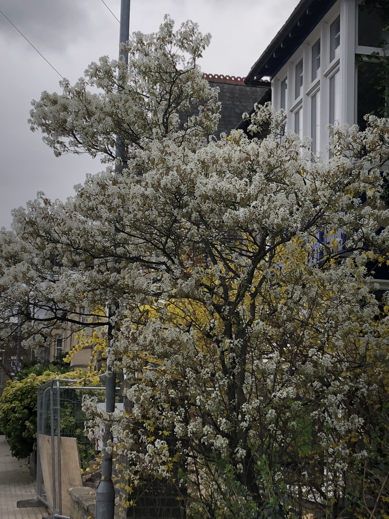 But I have a confession: I have never grown it myself. When my beloved Cornus kousa ‘China Girl’ was transplanted just over a year ago, I feared I had killed it, and was planning to get an Amelanchier to replace it, but in fact, it seems to have pulled through – in spite of ending up at an alarming angle to the ground after the alphabet soup of storms in mid-February. (I hastily staked it upright again, and it is just coming into leaf.) I can’t contrive a space for a snowy mespilus – or not until the squirrel-planted hazel, which I foolishly let grow away about twenty years ago, and which (in our area) is now protected, pops its clogs. But luckily, as shown above, I am surrounded by them, and at this time of year they are a wonderful and cheering sight.