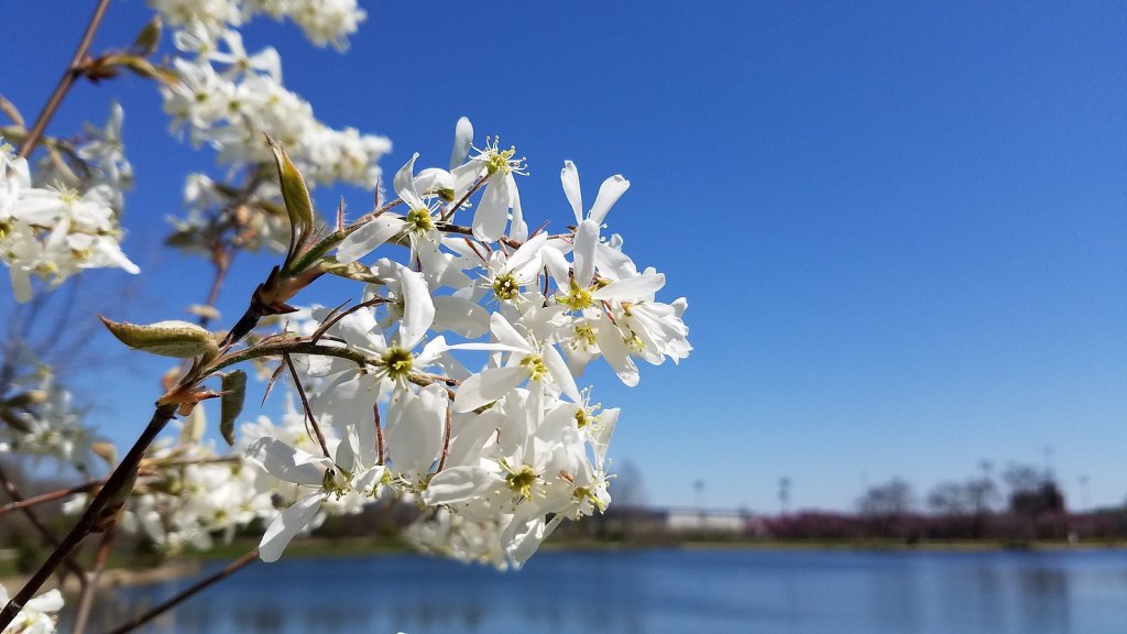 The white blossom in spring is accompanied by pink leaves which change to green, followed by edible berries, called ‘pomes’, which can be used for jams and pies, and also for a fruit wine: some hybrids have been bred specifically for fruit and are grown commercially in North America. They can also be used, dried, in pemmican – a high-calorie, long-lasting food that I recognise from Swallows and Amazons etc. but which I had no idea originated with the Cree nation (where the word is pimîhkân). The green foliage turns a glowing brown in autumn before falling, and the bark is also attractive, assuming of course that you are growing it as a tree rather than a bushy shrub.