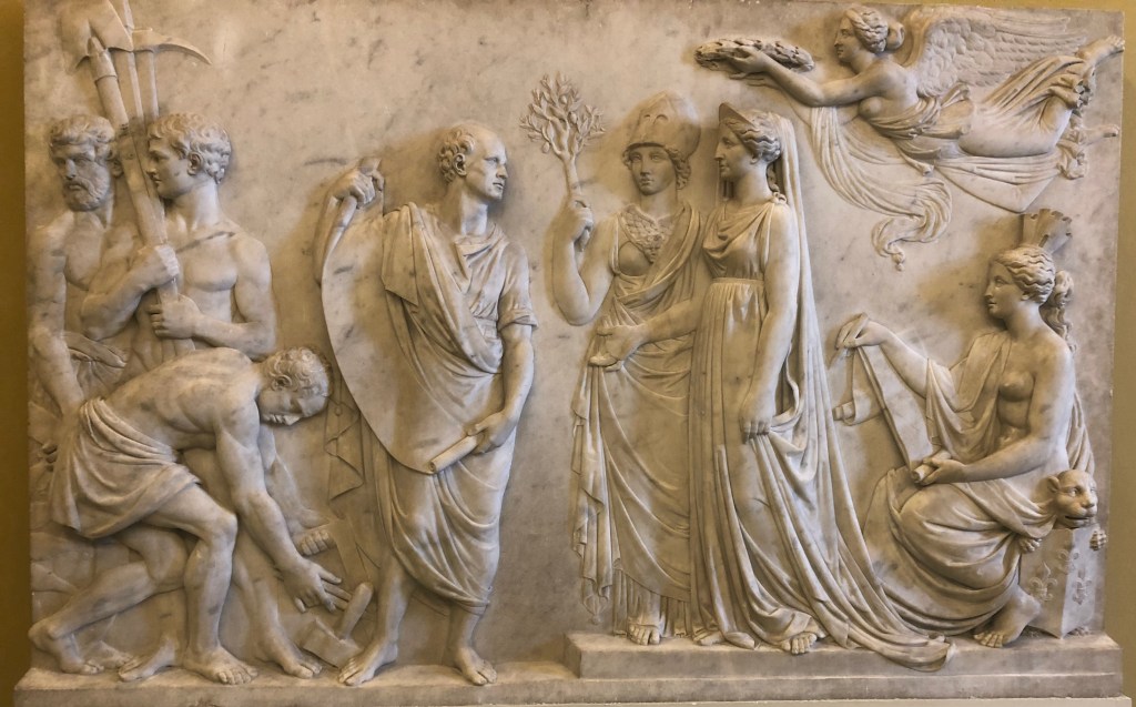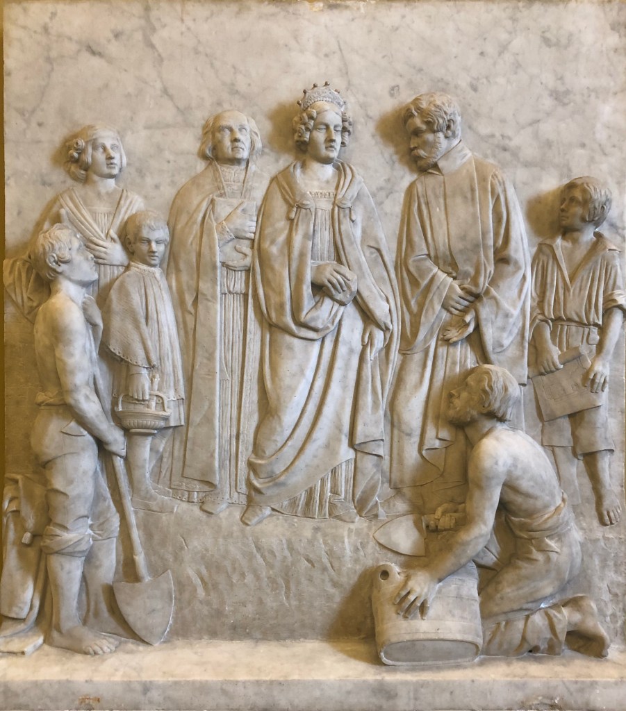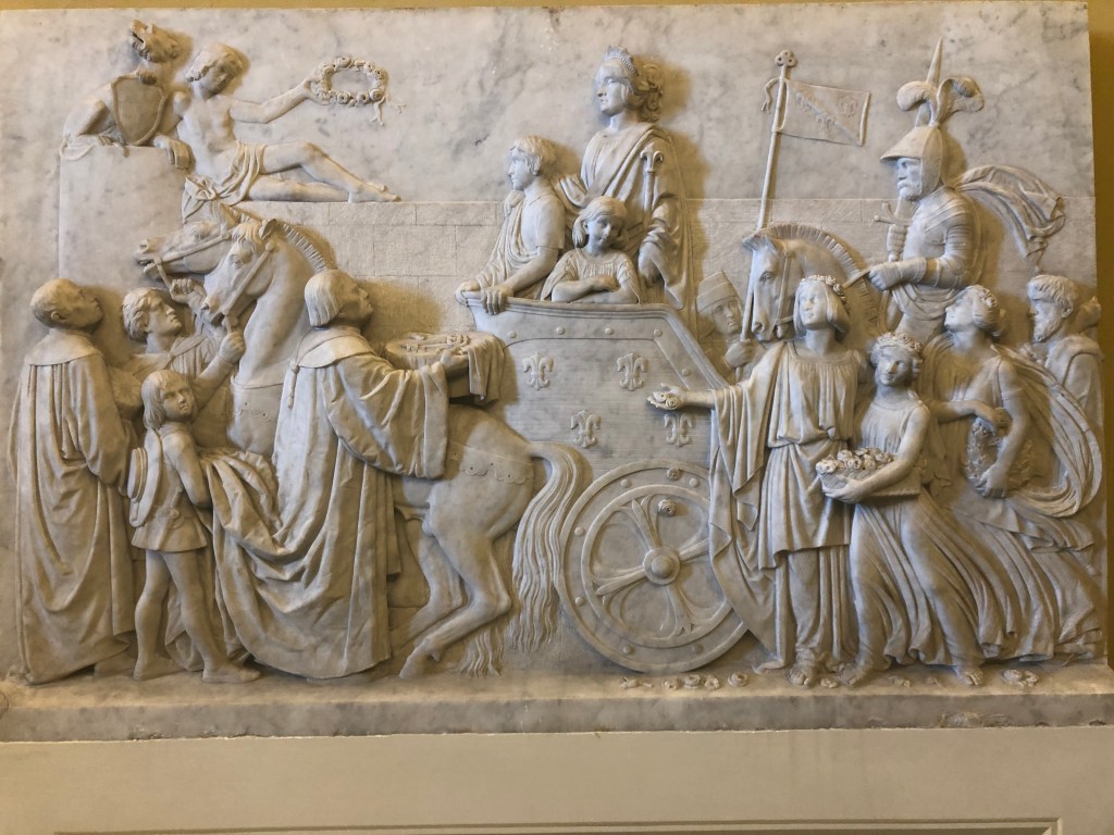 Various marriage projects were contemplated (including one to the future Charles X of France), but none was fulfilled. Instead she spent a lot of time and money on her new duchy, not least in attempting to remove all traces of Elisa from the city. The interior of the Palazzo Ducale was completely renovated, and the statue of Napoleon was removed from the Piazza (I imagine that she also tried to change its name, but it is Piazza Napoleone today). It was replaced by another statue, by the indefatigable Lorenzo Bartolini, of Maria Luisa herself, as benign mother of her city. She supported the arts and sciences, but her most important contribution was the building of an aqueduct to bring water to the city. This is commemorated in one of the four reliefs formerly round the side of the statue’s plinth, but now in Palazzo Mansi.