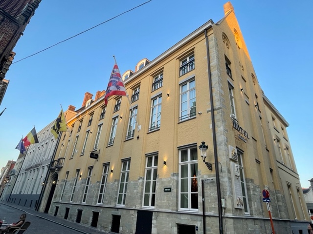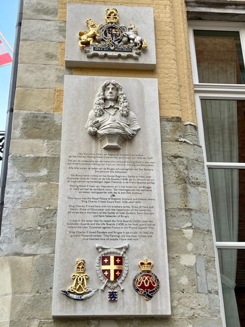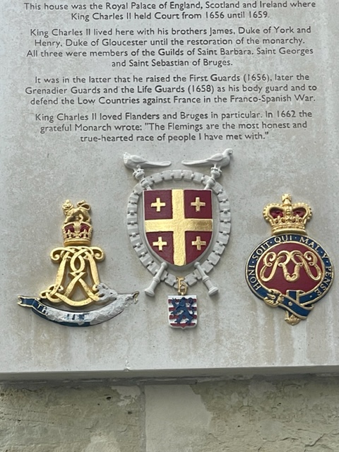 Charles spent his first two weeks in the fifteenth-century Hof van Watervliet, moving subsequently to the Huis Casselbergh (now the Grand Hotel Casselbergh, of which the ‘state of the art’ = ‘modern and hideous’ side overlooks the canal). How he spent his time, in between negotiations which involved travel to the Pyrenees at one point, is not clear. (As far as is known he did not father any children in the city.) But as the plaque says, he and his brothers joined three Brugge guilds, and raised from among their members the first recruits for two legendary British regiments.